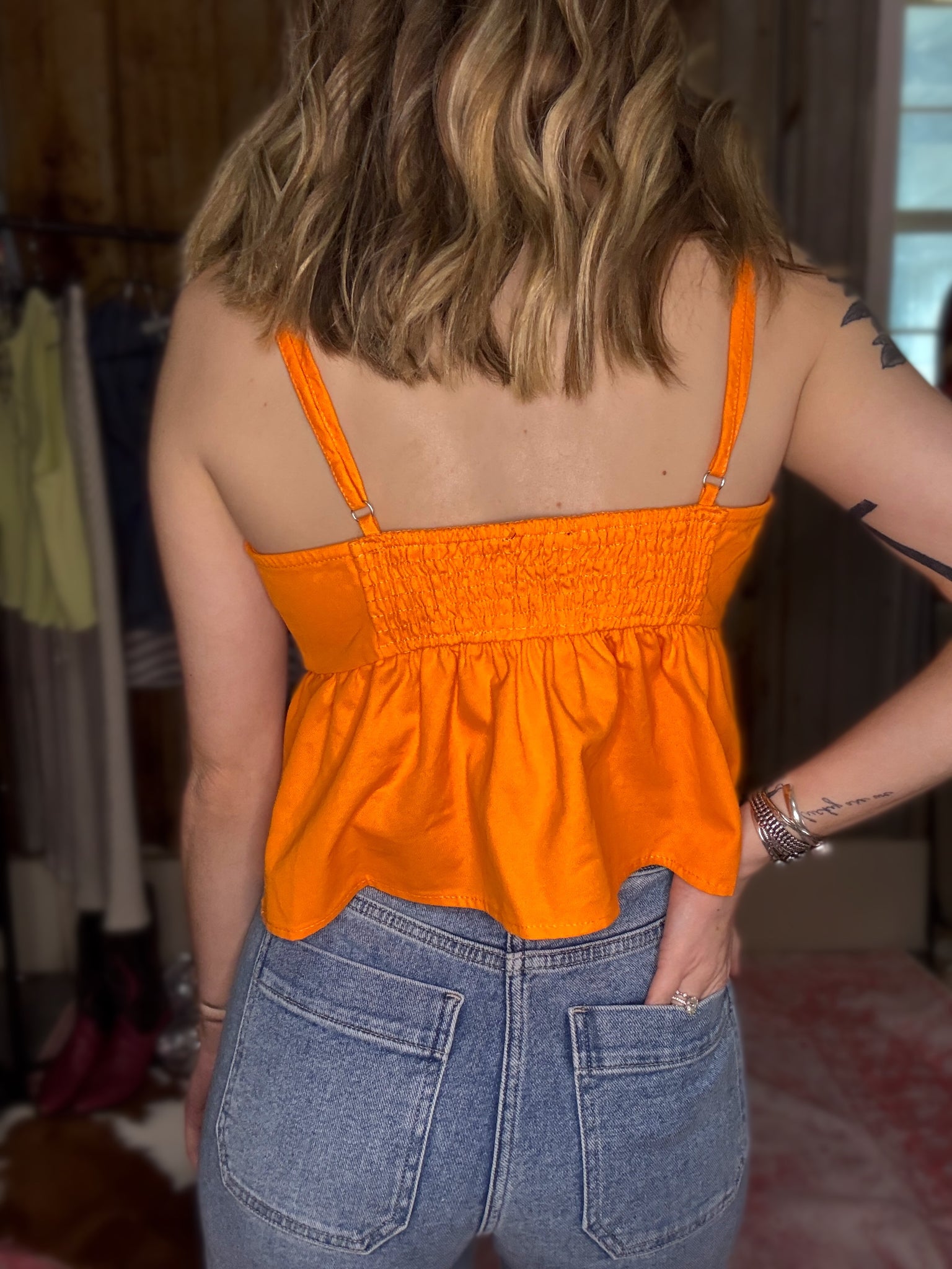 Cutie bright orange bow detail denim top