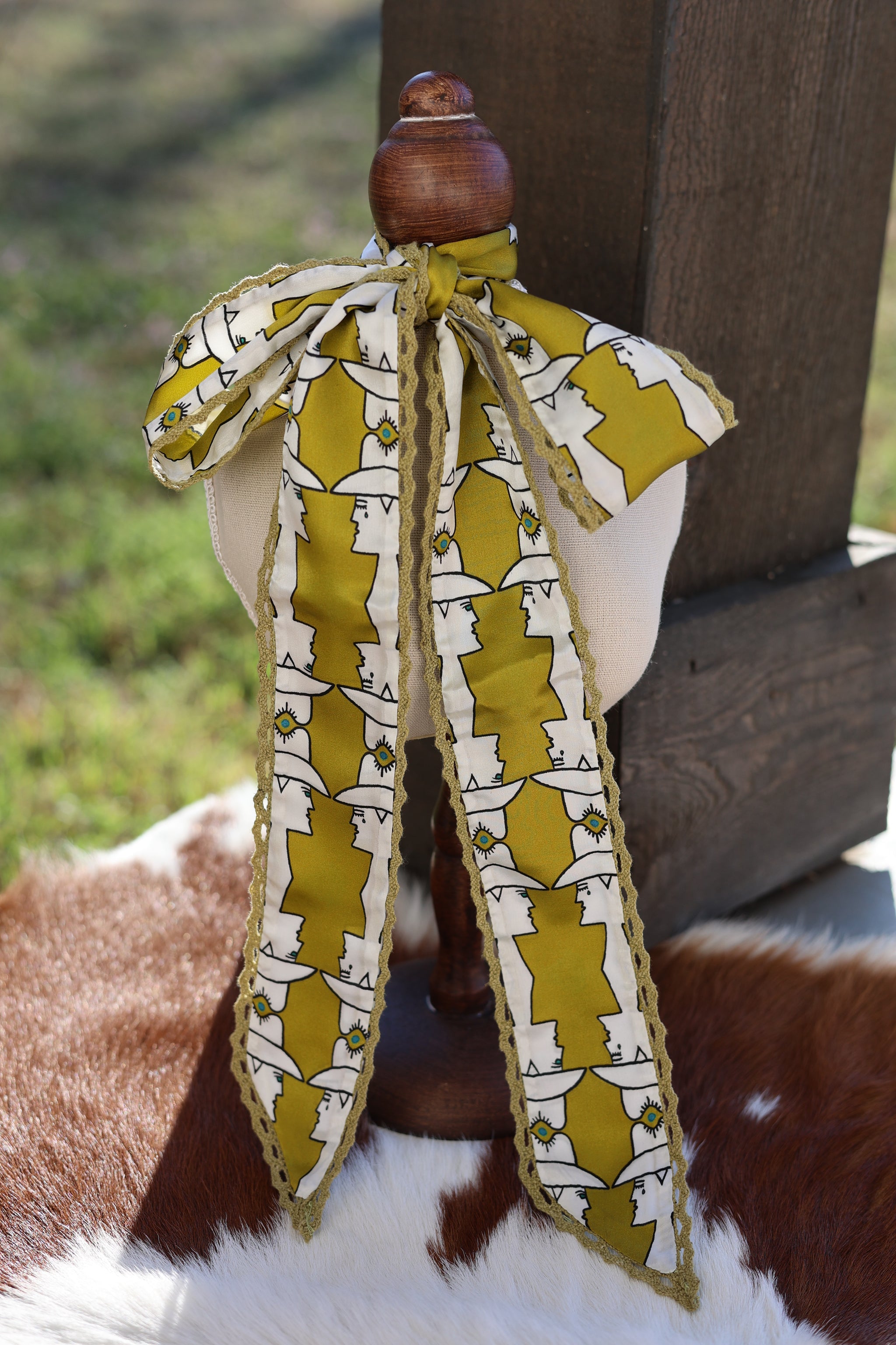 These twilly’s are EVERYTHING!! Stand out with The Allie Falcon Mod Maud twilly. Hand drawn art on a beautiful silk twilly with a crochet trimmed edge.
